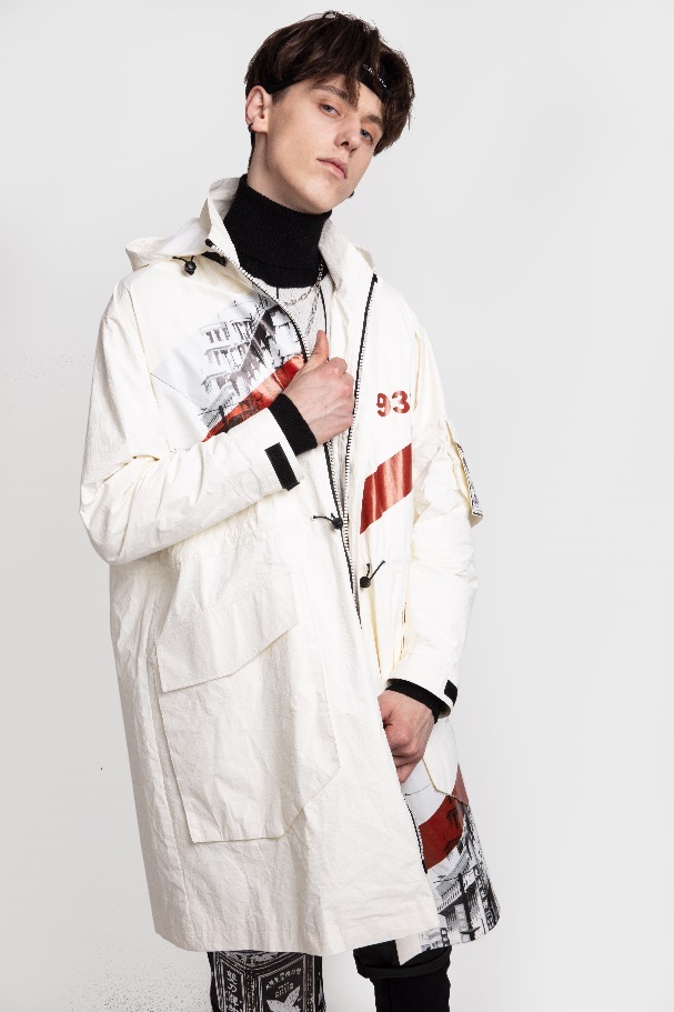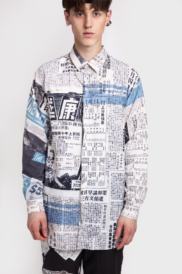 主題下分為三個(gè)系列,第一個(gè)系列是情報(bào)系列,也是特色系列。為此我專門去上圖查閱了新民晚報(bào)在建國后的期刊,搜集創(chuàng)作素材,結(jié)合over size的潮流設(shè)計(jì)了報(bào)紙素材拼貼襯衫,紙質(zhì)肌理的老上海街景燙畫輕質(zhì)風(fēng)衣等。第二個(gè)系列是霓虹系列,靈感來源于百樂門,南京路的夜景,因?yàn)橐股钍枪沤裆虾W罹叽硇缘姆?hào)之一,主要通過解構(gòu)主義印花的方式呈現(xiàn)。第三個(gè)系列是夜光系列,靈感來源于梅雨季節(jié)的路面星光,燈紅酒綠支離破碎的倒影,主要以各類熒光色條紋的重組作為圖案.