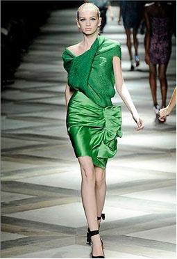 清新的綠色有如有氧呼吸一樣讓人 精神振奮,扯拽出的斜肩褶皺造型讓人 眼前一亮。