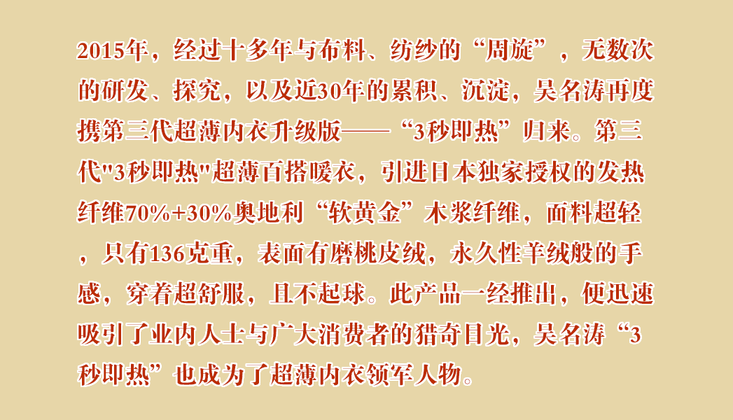但只要你讀懂3秒即熱概念的提出者吳名濤,讀懂他“一生只專注一件事”的堅(jiān)持,你便懂得了,3秒即熱“一個(gè)單品、一個(gè)臻品”的魅力所在!