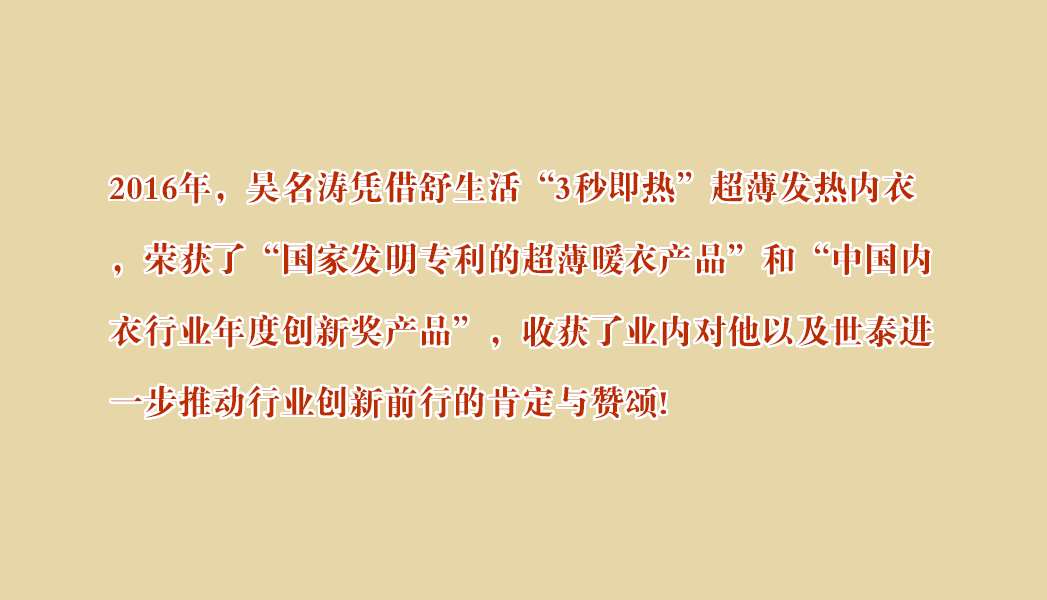 2015年年初,廣東世泰服飾有限公司推出“3秒即熱”超薄發(fā)熱內(nèi)衣!自創(chuàng)立伊始,便奠定了“一個(gè)單品、一個(gè)臻品”的基調(diào),以單品“3秒即熱”超薄發(fā)熱內(nèi)衣進(jìn)軍內(nèi)衣市場(chǎng),用具有“觸膚即暖,3秒即熱的良好性能和四針六線的精湛工藝,并結(jié)合了立體裁剪的版型,給消費(fèi)者從未有過(guò)的穿著體驗(yàn),你或許疑惑:為什么世泰服飾要選擇并堅(jiān)持“一個(gè)單品、一個(gè)臻品”的理念?